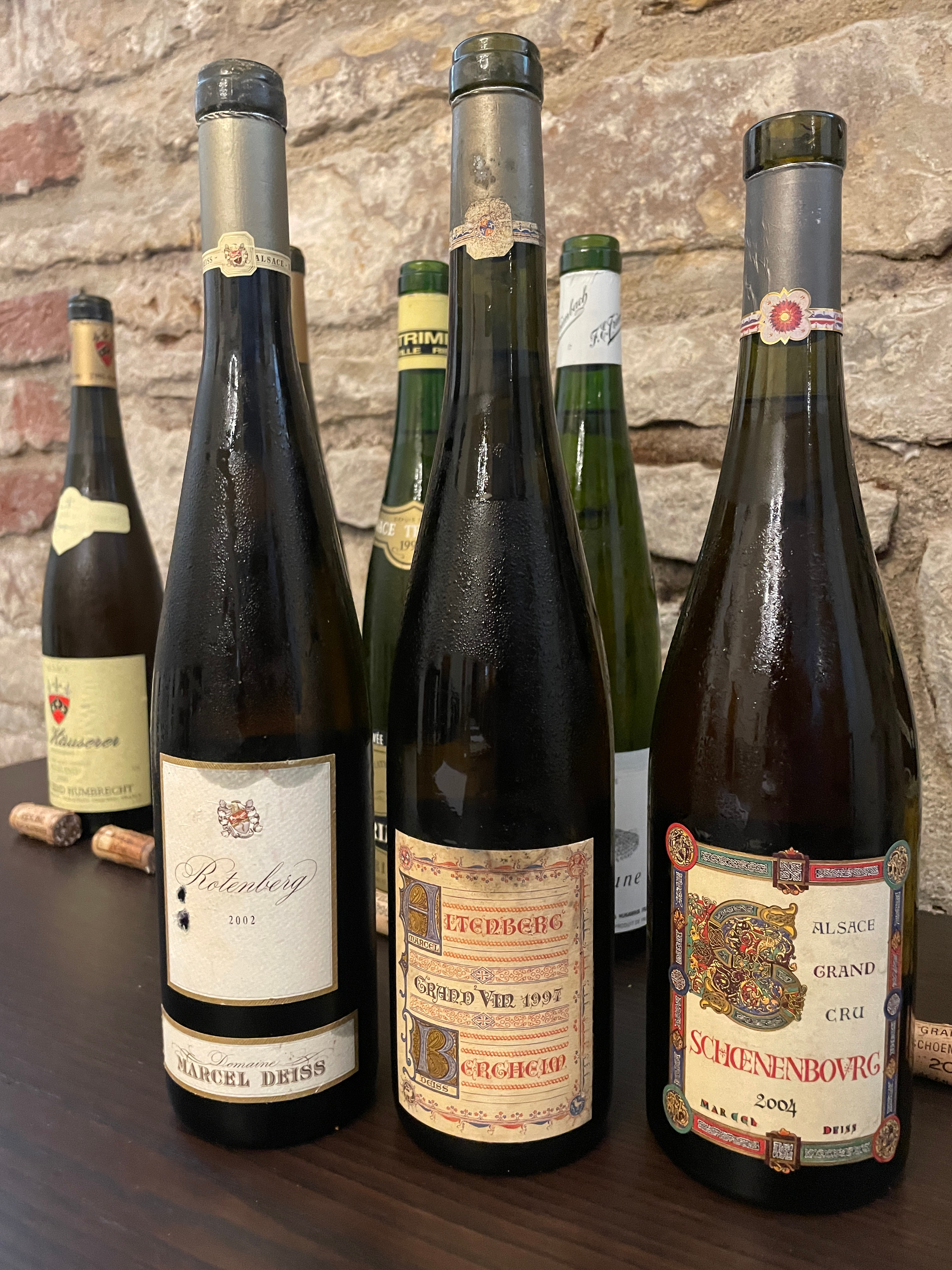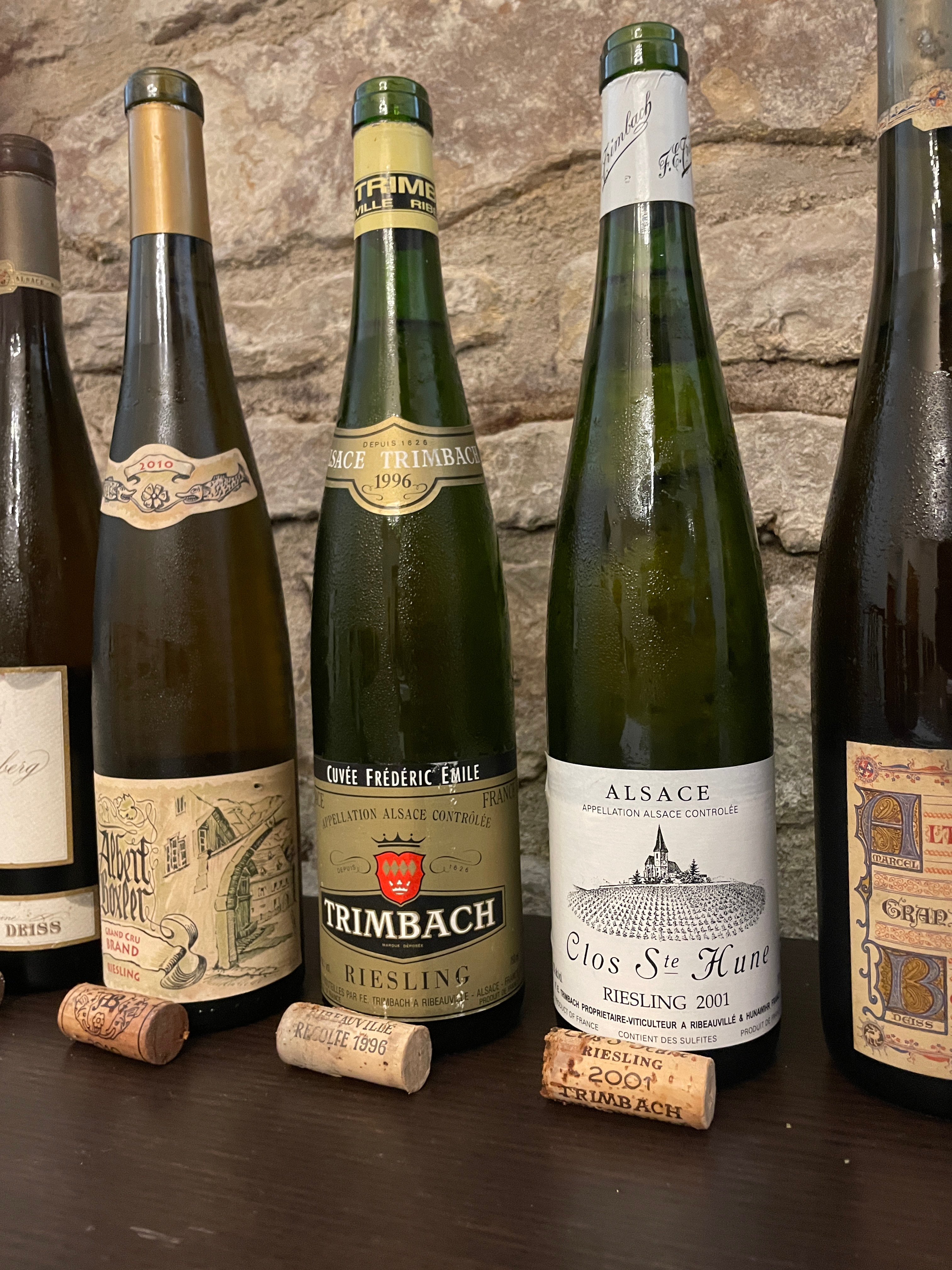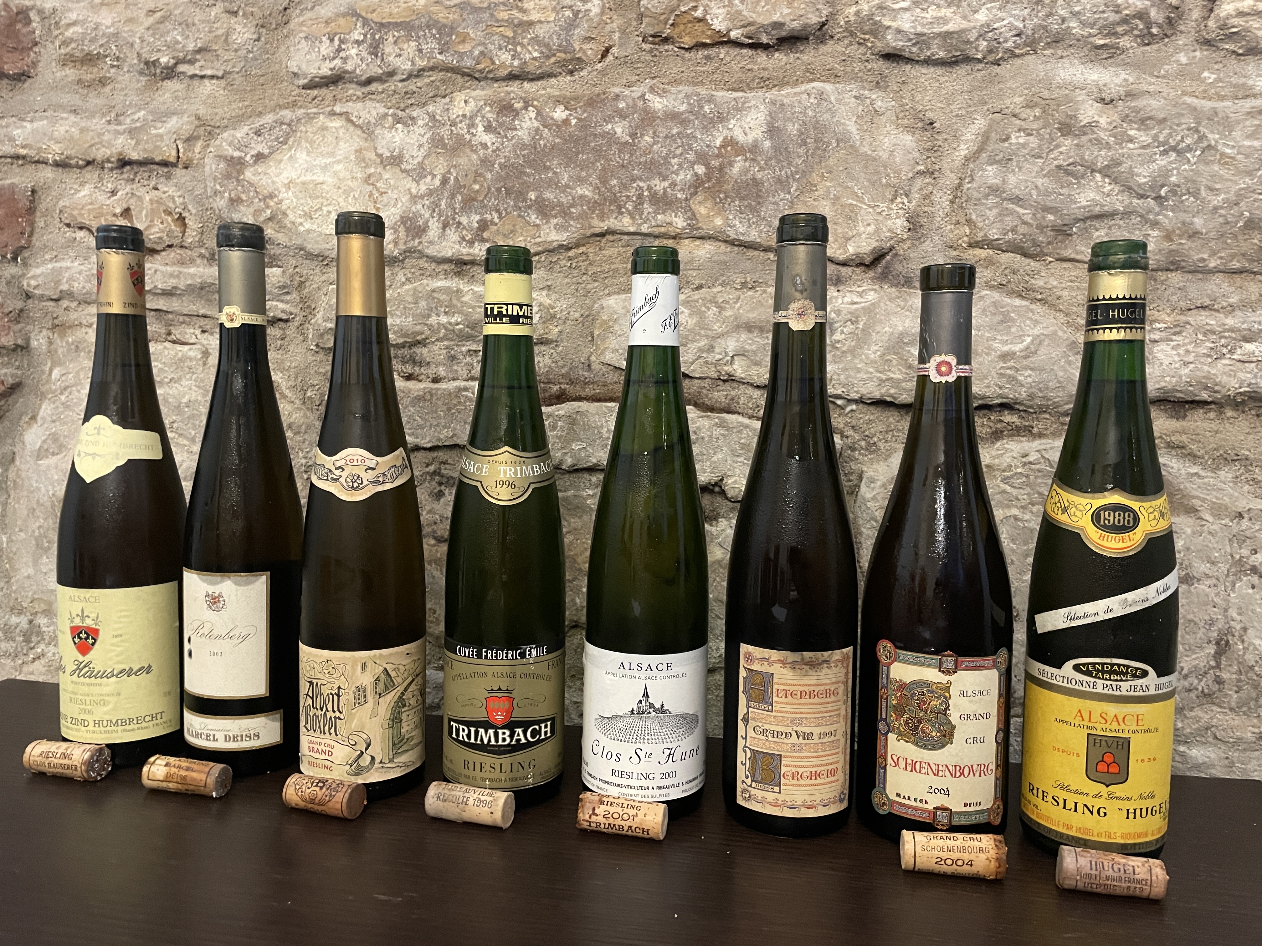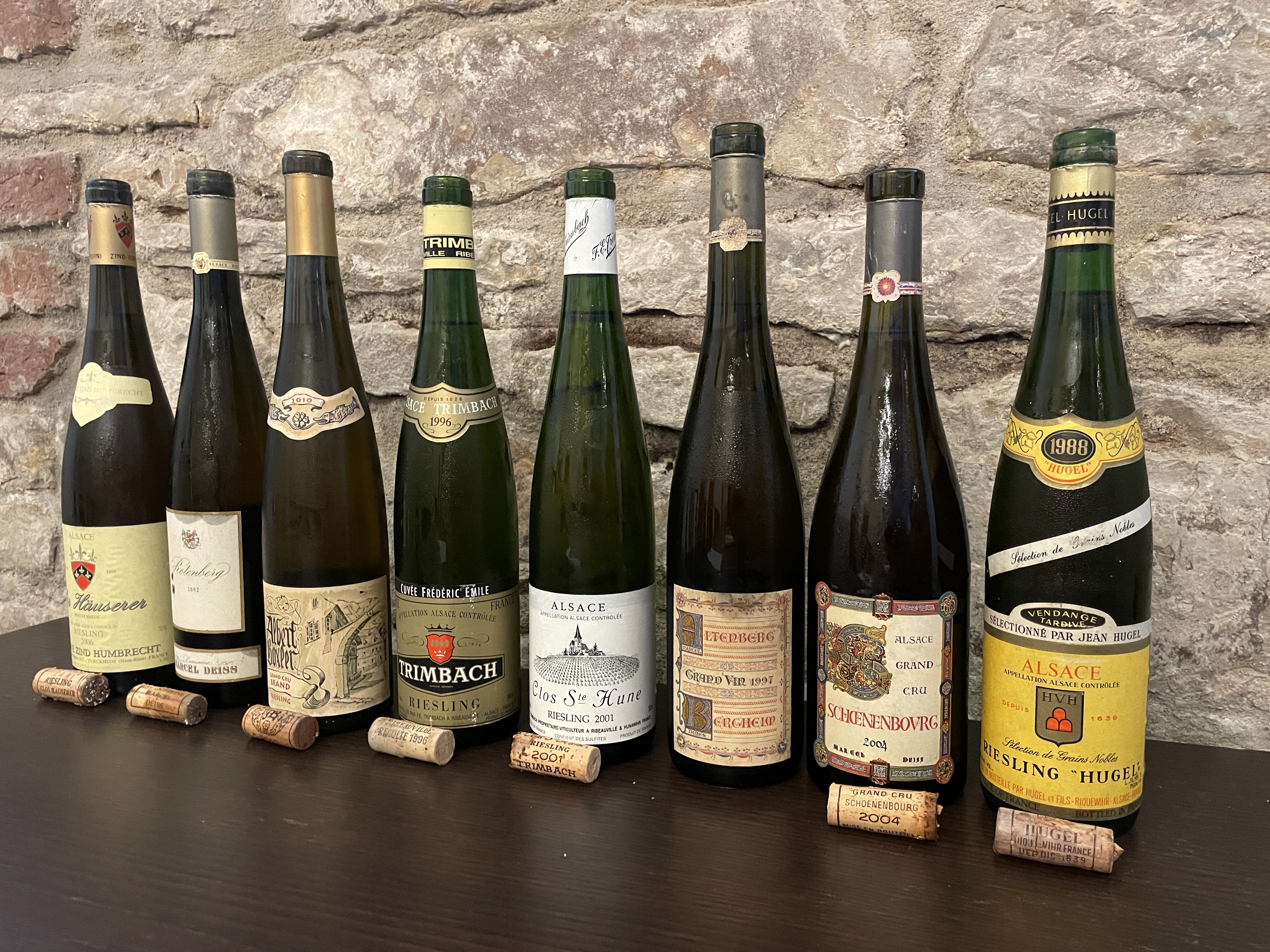Alsaská vína mají u nás hodně obdivovatelů, přesto se potýkají s řadou problémů vedoucích k menšímu zájmu o tato vína v porovnání se zbytkem Francie. K problémům řadím nešťastný systém Grand Cru i relativně hodně vín se zbytkovým cukrem s nejednoznačnou identifikací tohoto faktu na etiketě. Naše degustace tyto problémy potvrdila, i když jsme si užili několik opravdu výjimečných vín. Jednoznačným vítězem degustace bylo nejslavnější suché alsaské víno - Clos St. Hune 2001 z vinařství Trimbach. Víno velice elegantní, jemné a nekonečné. Jejich další suché víno Cuvee Frederic Emile 1996 skončilo třetí a to jsme si ještě přidali jejich víno z ročníku 2008 a to by útočilo na nejvyšší pozice také. Na druhém místě mylo velmi sladké víno, ve kterém však byla sladkost vlivem stáří vína již krásně zakomponovaná do celkové struktury vína -  Riesling Selection de Grains Nobles 1988 z vinařství Jean Hugel. Zklamáním pro mne byli vína od dalšího legendárního vinařství - Marcel Deiss. Vína se zbytkovým cukrem byla přece jen trochu fádní a s věkem se nevyrovnávala tak, jak bych očekávat. Byla poměrně dost terciární.