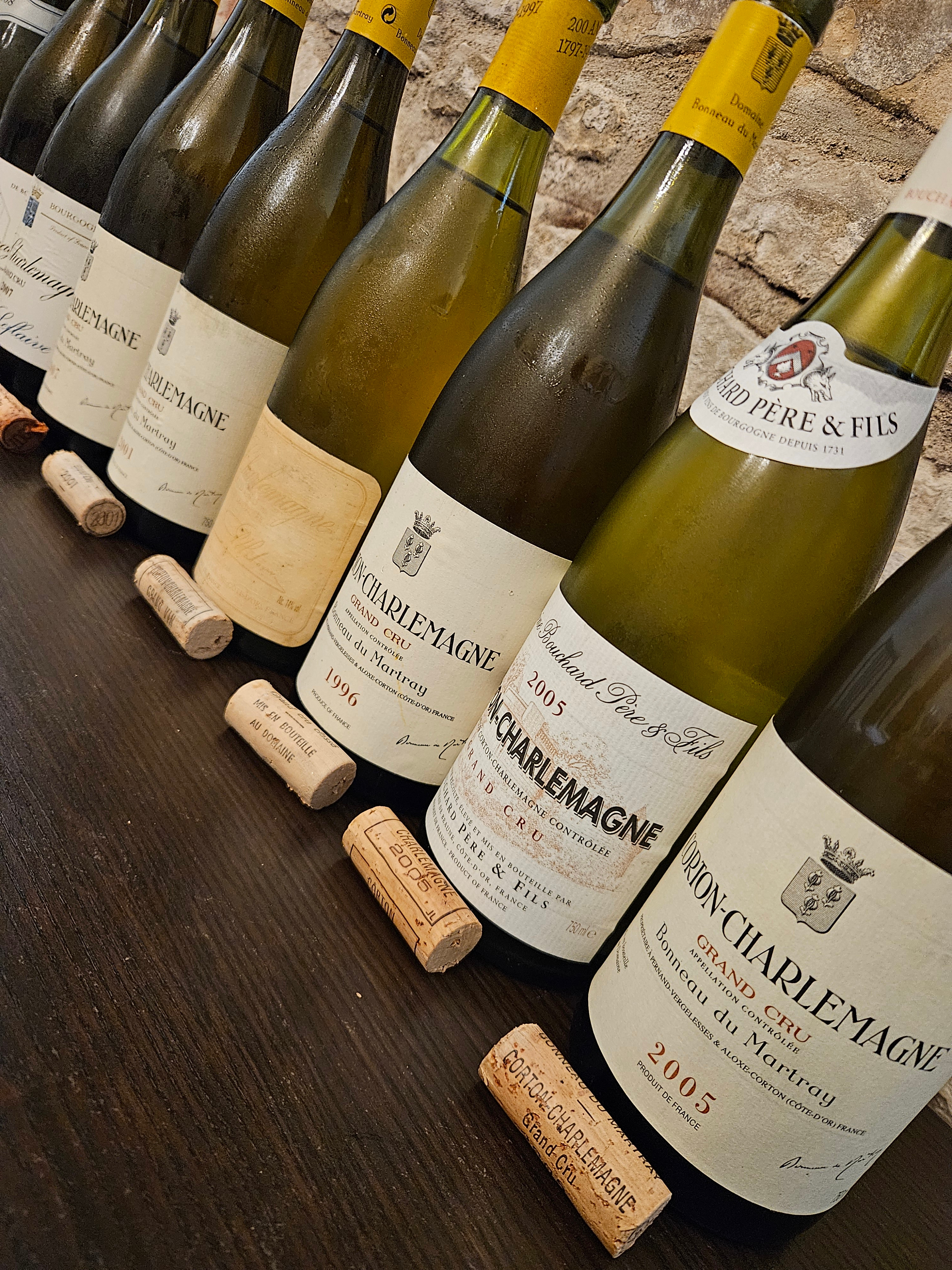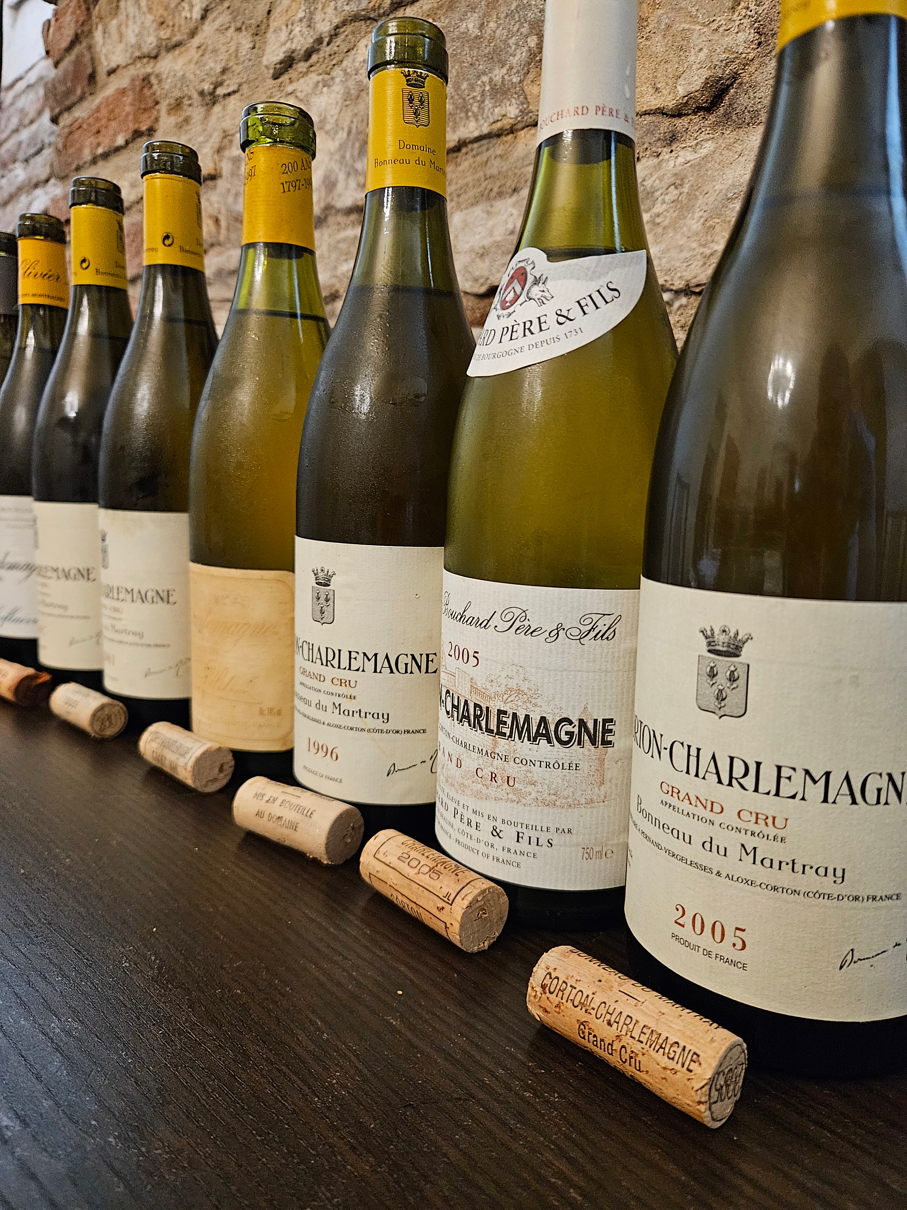 Corton Charlemagne je největší bílé Grand Cru s největším počtem vinařů. Do degustace jsme vybrali jen vína od vynikajících vinařů, přesto byly rozdíly v kvalitě obrovské. Samozřejmě velikou roli v kvalitě hrál ročník. Přestože jsme měli celkem 4 vzorky od nejvýznamnějšího vinařství této apelace Bonneau du Martray (oproti plánu byl ještě přidaný ročník 2007), vítězem se překvapivě stal roční 2005 od Bouchard Père & Fils. Víno svěží, čisté, elegantní a nesmírně dlouhé. Těsně v závěru byl Bonneau du Martray 2001, víno v ideální kondici s jemnými terciárními tóny. Na třetím místě byl Bonneau du Martray 2005, který překvapivě trochu zaostal za Bouchard Père & Fils.