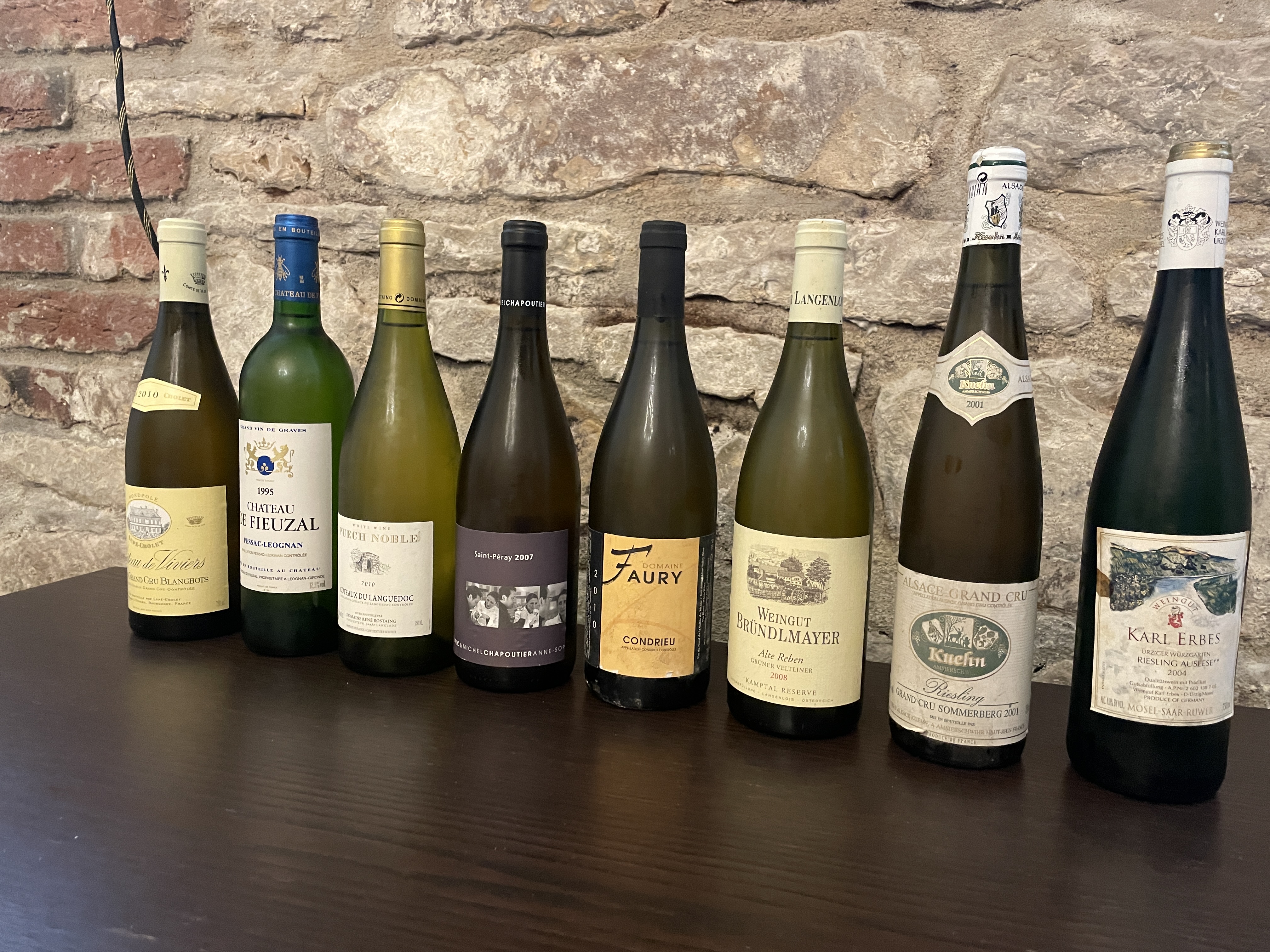 Na degustaci řady různých starších bílých vín si každý našel víno, které ho zaujalo. Přesto dvě vína byla zklamáním - Chablis Blancheots Grand Cru 2010 působilo překvapivě již dost unaveným dojmem a vůbec projevem neodpovídalo kategorii tratě a alsaský Riesling GC Sommerberg 2001 byl jednoznačně vínem, které mělo svůj zenit dávno za sebou. Naopak krásně svěžím dojmem působil vítěz degustace - Condrieu 2010 z vinařství Faury, které dokázalo, že i Viognier umí krásně stárnout. Na druhém místě bylo Bordeaux Ch. Fieuzal 1995, krásně pitelné a strukturované víno, třetí byl sladký moselský Riesling 2004, samozřejmě úžasně svěží a ovocný a těsně na čtvrtém místě Gruner Veltliner 2008 z Kamptalu, také v úžasné kondici.